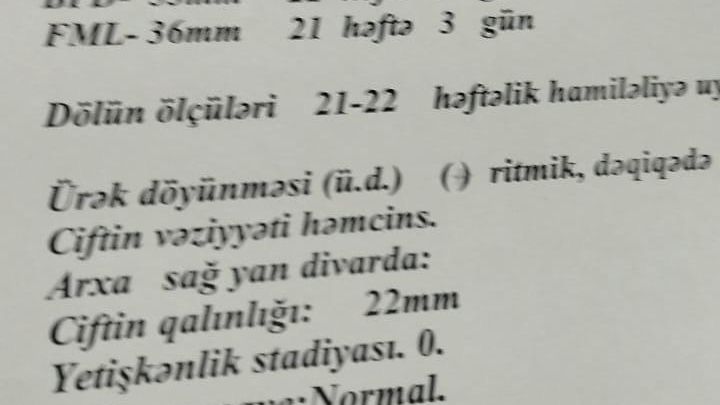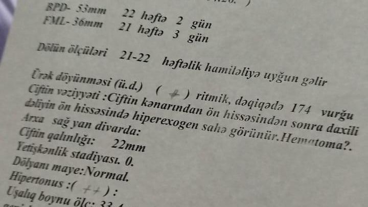 Sən demə, su açılışı olub, onu da bunlar ediblər. Qolumda sistem, ağrıdan ağlaya-ağlaya həkim otağına getdim ki, mənə baxın. Təsəvür edin yenə o halda usm otağına qədər məni yeritdilər. Bu dəfə dedilər su açılışı olub. Mənə Nərmin adlı qızın usm nəticələrin veriblər. Dedilər, iki gün burada qal, uşaq qalsa qalacaq, qalmasa götürəcəyik. Mənim bədənimə zəhərlənmə verməyə başladı, həkimlər isə maraqlanmır. Ailəm məni başqa xəstəxanaya yerləşdirdi. Uşağım tələf oldu. Mən deyəndə su gəlir, deyirdilər, hematomadı təmizlənir. O ağrılarla xəstəxanada gəzib həkim axtarır, yalvarırdım ki, mənə baxın. Digər xəstəxanada dedilər ki, uşağın tələf olmasına səbəb vurulan analgin və dimedrol olub. Uşağımı 3 saylı Şəhər Kliniki Xəstəxanasındakı həkimlərin etinasızlığı tələf etdi”.